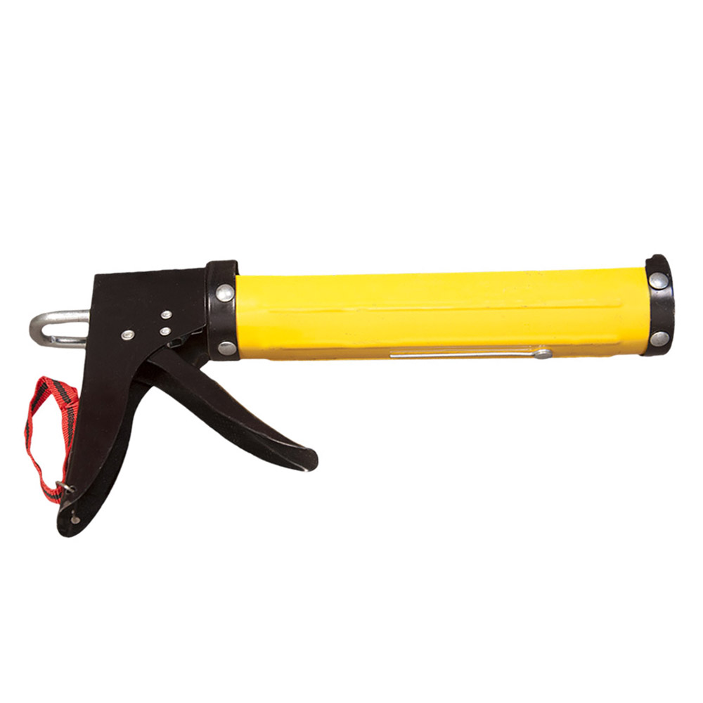Return To ShopThese gun is used with up sealent.The ratchef style pressure rod has teeth that hold the rod in place after each pull of the trigger. For a thinner materials this helps minimize drips. A spout cutter is built into the sides of the gun for opening cartridges without a knife and a wrist allows the gun to be held more securely. The caulking gun includes one dual hotel cup for use with bulk caulk or sausage packs one ring cap for attaching nozzles three plastic, one nozzles and one 12 diameter metal nozzle. Caulking gun also called caulk or cartridges guns dispense a controlled flow of products such as caulk sealant and adhesives from a tube or cartridge. A manual caulking gun consists of a frame which holds the tube a trigger and a rod which moves forward when the trigger is depressed dispensing the product. Manual caulking guns have a ratio. The higher the ratio the easier it is to dispense the caulk sealent.Air powered caulking gun also have a frame and a trigger but are used with an air pressure regulator that pushes the product from the tube using air pressure instead of rod. It is eco friendly.
